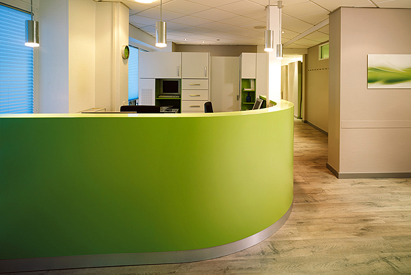 Den großzügigen Empfangsbereich können unsere Patient*innen gar nicht verfehlen. Hier können Sie sich anmelden, Termine vereinbaren oder Rezepte erhalten.