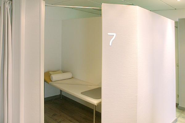 Die Behandlungs- und Versorgungskabinen befinden sich im hinteren Teil der Praxis und sind so gestaltet, dass sie sowohl die notwendige Abgeschlossenheit bieten und gleichzeitig durch die nach oben offene Bauweise kein Engegefühl aufkommen lassen.